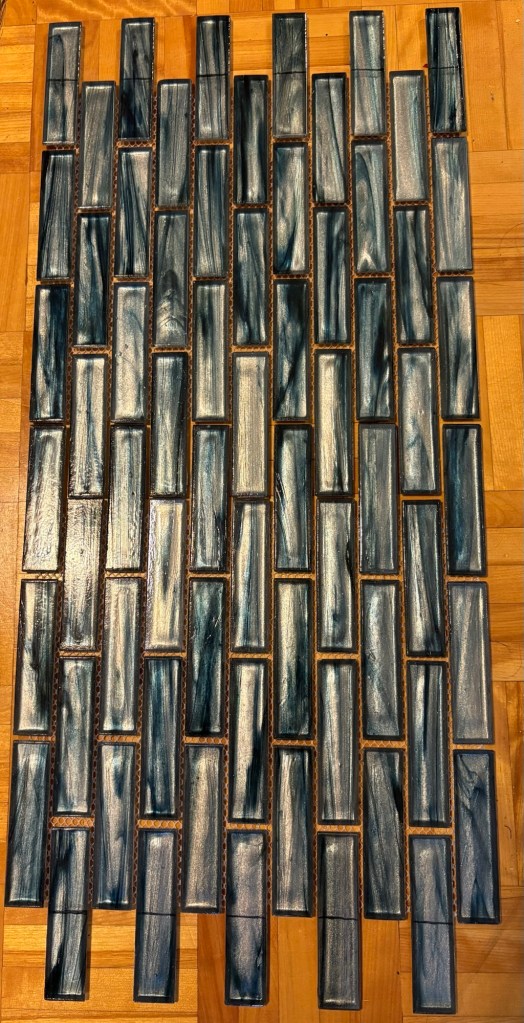 On Sunday, I began the backsplash work, but it was mostly preparing for it because I needed to make space for the saw and such. I marked the first tiles for future cutting. It took me a lot to get to this point. I kept thinking I had to do it in a more complicated way, but then I measured and realized this is all that’s needed for the one spot. I was worried it would stick out far beyond the sink cabinet, but it’ll only be about half an inch.