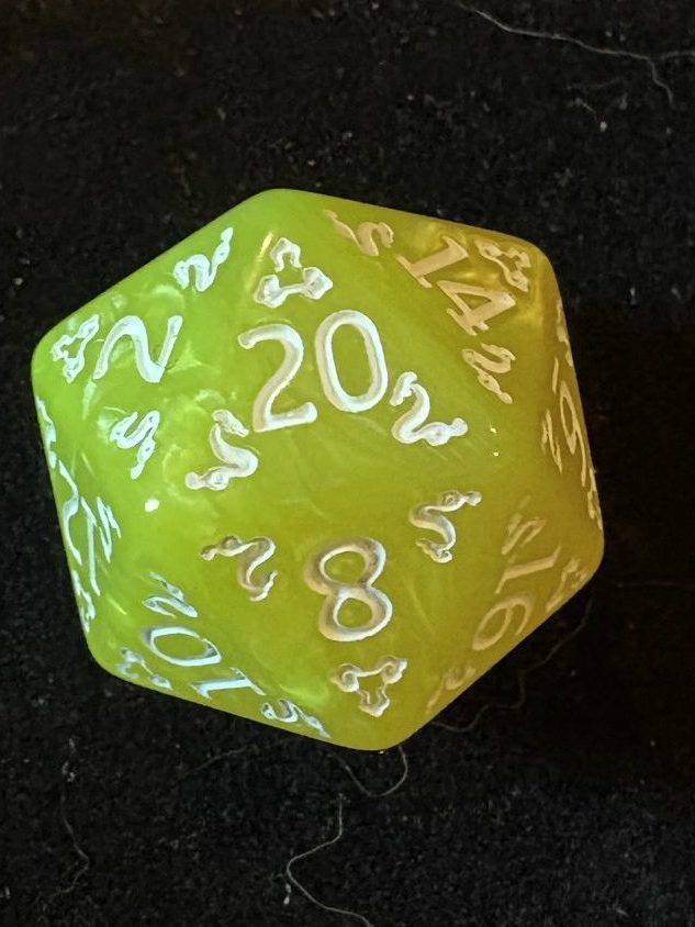 It was also game night. The current campaign is so different than the last. We had a ridiculous amount of time spent on traveling in the previous one. And we were mostly in caves or ruins. So far, we are in a city and often doing errands or fighting a larger variety of foes. This week, I won the pie-eating contest thanks to this nat 20.