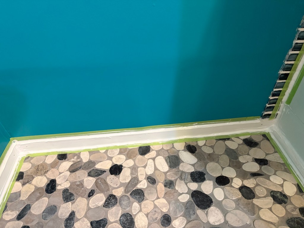 Unsurprisingly to me, tape removal didn’t go well. It was OK for the wall area, but not the floor. I don’t know if that was because it is an uneven surface, or because the floor is colder, or because the time I left wasn’t correct. Thankfully, I had enough caulk left to lay more down.
